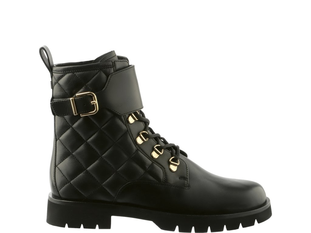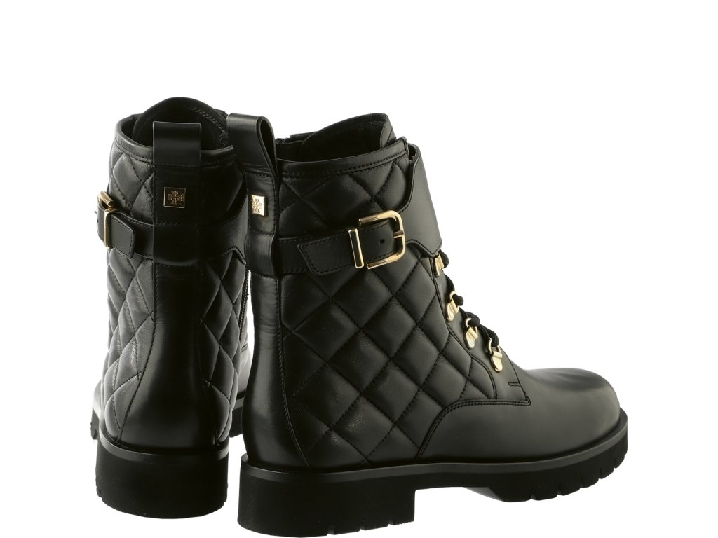 Dámska členková obuv Högl z prešívanej hladkej čiernej kože. Obuv má zlaté detaily-pracku cez holeň a detaily na šnurovanie. Na vnútornej strane obuvi je zips, ktorý uľahčuje obúvanie a vyzúvanie obuvi. Tieto členkové topánky majú blokový podpätok s výškou 35 mm.