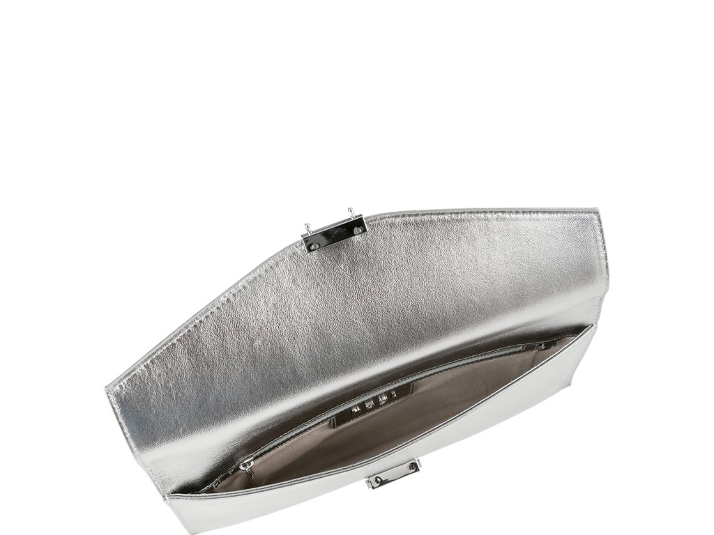 Dámska listová kabelka Högl z jemnej hladkej jahňacej kože. Kabelka je ideálnym doplnkom na ples alebo na rôzne večerné formálne aj neformálne akcie. Vďaka striebornej farbe pôsobí kabelka formálne a zároveň zmyselne, zatiaľ čo si zachováva jemnosť a eleganciu. Magnetické zapínanie uľahčuje otváranie tejto kvalitnej kabelky Rozmery: 27 x 4 x 15 cm.