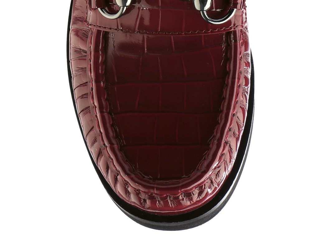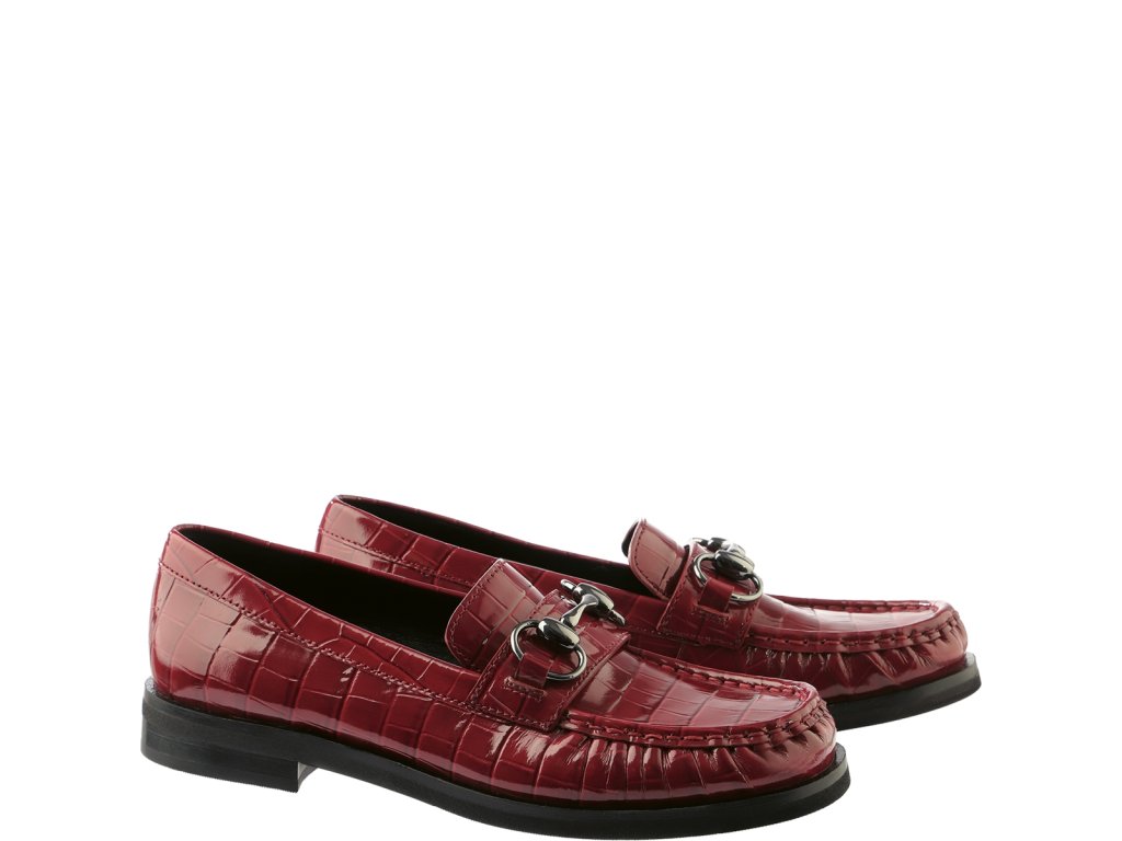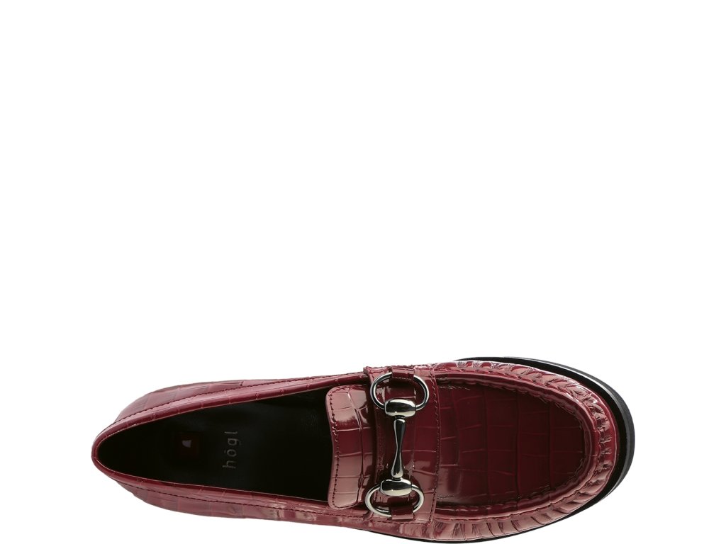 Dámske mokasíny Högl z lakovanej kože s krokodílím vzhľadom. V prednej časti sa nachádza strieborná kovová spona. Obuv má blokový podpätok s výškou 25 mm.