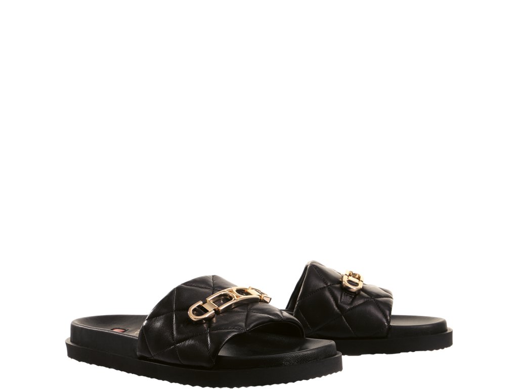 Dámske šľapky Högl na nízkej platforme. Obuv je vyrobená z jemnej hladkej jahňacej kože, v prednej časti sa nachádza dekorácia v podobe spony zlatej farby. Výška platformy je 10 mm. Šľapky sú vďaka penovej platforme a tvarovanej mäkkej stielke mimoriadne pohodlné. Tento kúsok by Vám v botníku nemal chýbať!